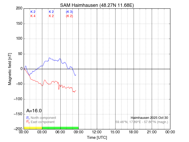 The scale on the vertical axis shows the intensity variation in nT, the horizontal axis shows UTC time.