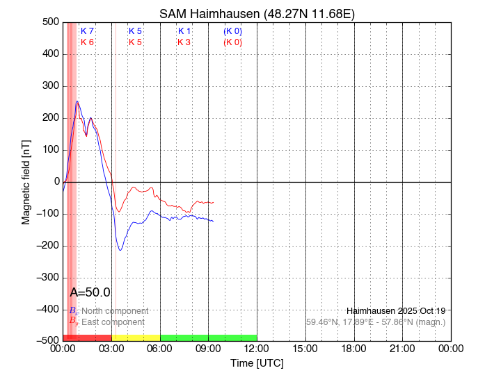 The scale on the vertical axis shows the intensity variation in nT, the horizontal axis shows UTC time.